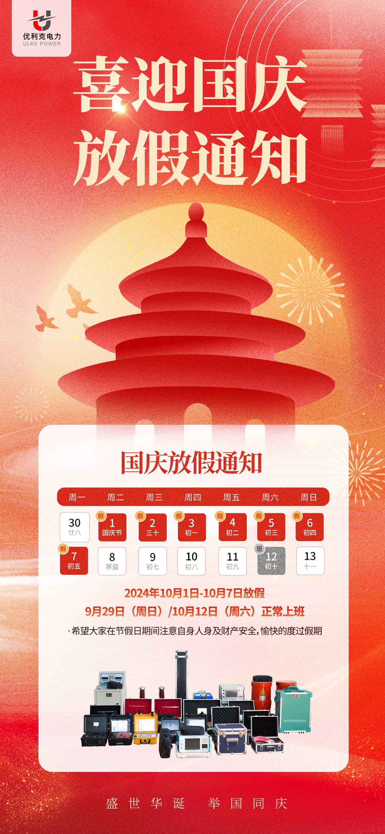 在此,優(yōu)利克電力設備有限公司全體同仁預祝您國慶節(jié)快樂,萬事如意!