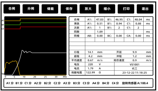 間。測試完成后,測試儀會在屏幕上顯示分合閘時間的測試結果,包括每相的分合閘時間以及三相的平均時間。同時,您可通過測試